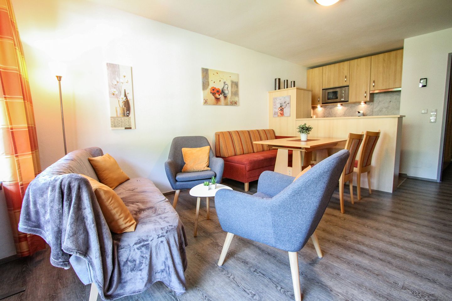 Het appartement Dettlbauer 63 | Top 17 heeft een aparte slaapkamer, een balkon op het noorden en een gezellig ingerichte woonkamer met open keuken. De ruime zithoek nodigt uit tot gezellig samenzijn 's avonds - perfect om de volgende dag in de bergen te plannen onder het genot van een glas wijn.